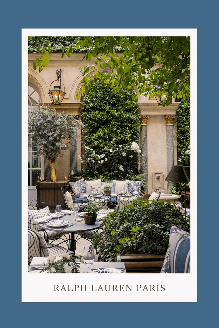 The combination of these elements creates a dining experience that’s both stylish and comfortable, in line with Ralph Lauren’s signature aesthetic of classic American luxury with a touch of French charm. Ralph’s Restaurant in Paris is everything we love about outdoor dining. I have created a mood board above to include a few pieces from the Beautiful House Collection and some images from my own garden and outdoor living area.