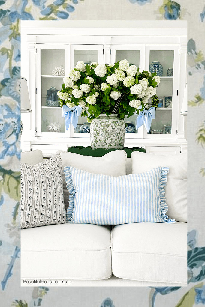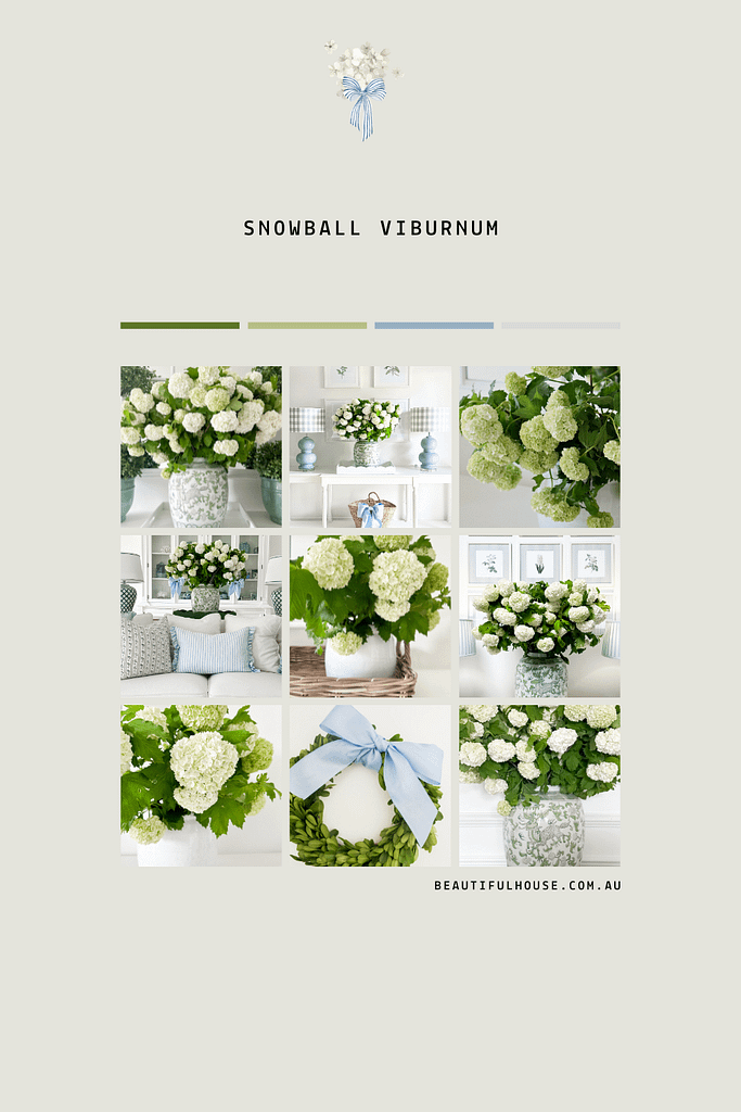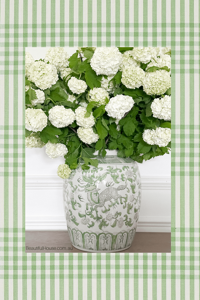 Snowball Viburnum is one of my favourite flowering plants. It makes only a brief appearance every spring here in Melbourne. This year the blooms have been full, beautiful, and white, I couldn’t resist buying a few bunches from my local greengrocer. And of course the perfect colour palette for a blue and white home. Here is a little bit about growing them in the garden and having them as cut flowers in your home.